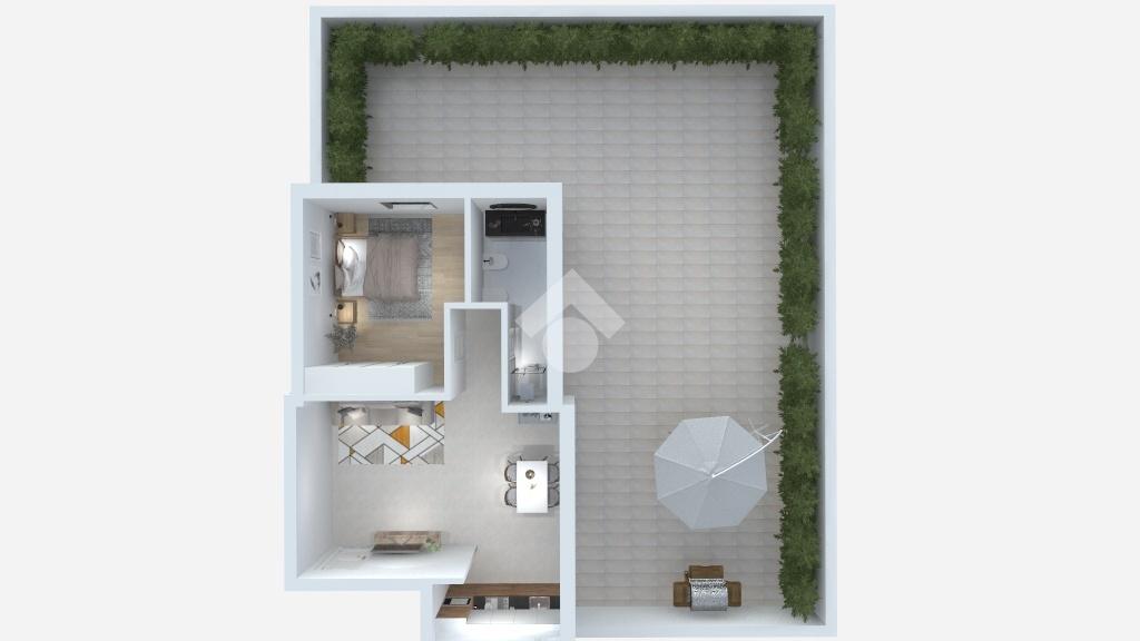 Ma il vero punto di forza di questo appartamento è l'esterno: 80 mq circa di giardino angolare interamente pavimentato, attrezzato con zona pranzo e zona relax, già protetto da una tenda da sole motorizzata (con chiusura automatica al vento), che d'estate trasforma lo spazio esterno in un vero secondo salotto.